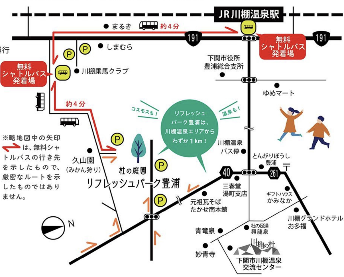 【福岡方面から】 九州縦貫自動車道→下関ICから川棚方面へ約40分 【広島方面から】 中国自動車道→小月ICから川棚方面へ約40分